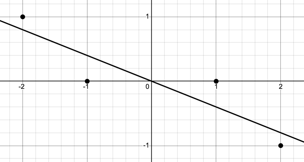 Figure 5 plots the data \[\{(-2,1),(-1,0),(1,0), (2,-1)\},\] together with its regression line of the form \(f(x)=ax\).