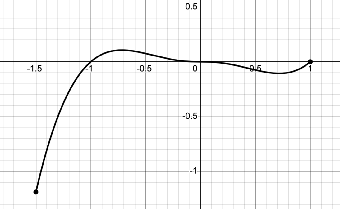 - The graph of \(f(x) = x^3\ln(x^2)\) over the interval \([-1.5,1]\) is shown in Figure 4. Find the exact locations of the absolute minimum and the absolute maximum over that interval.
