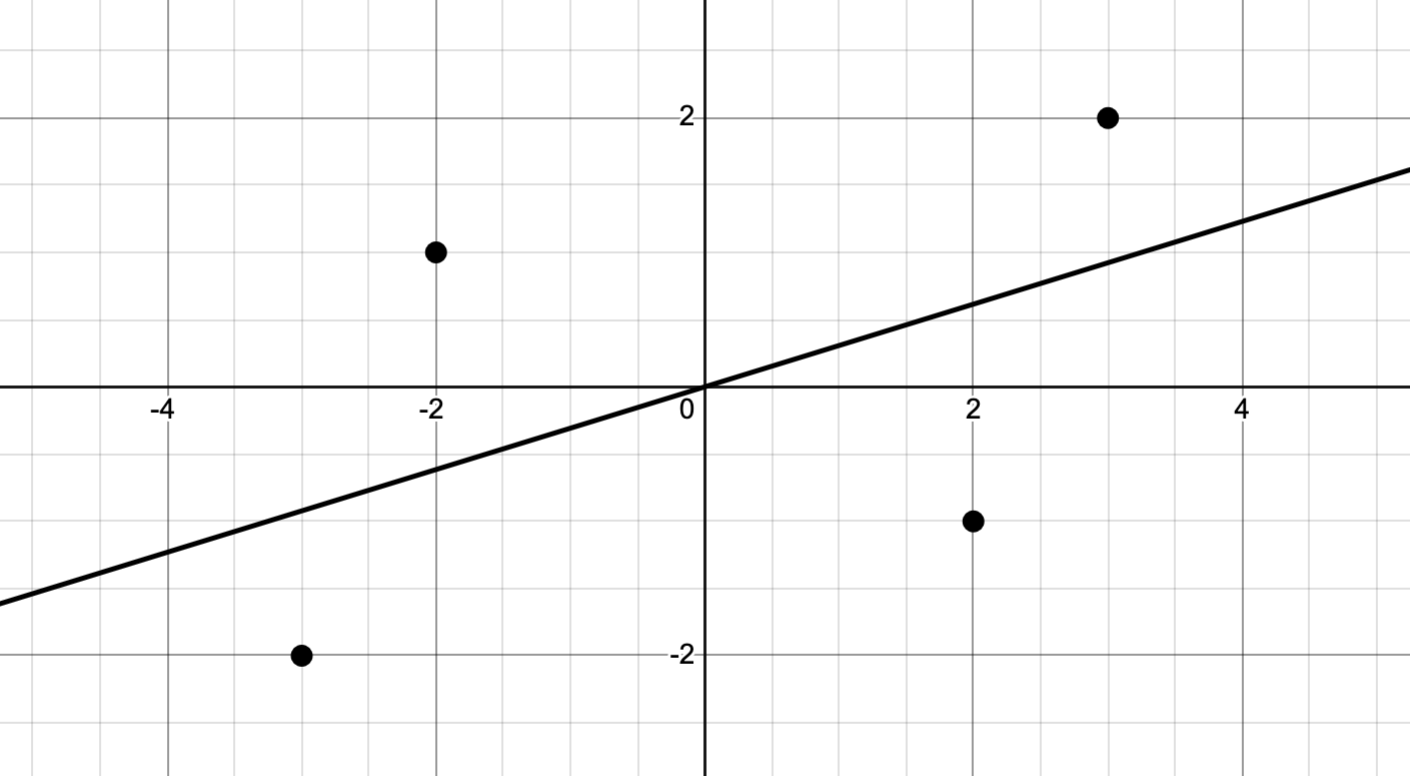 Figure 3 plots the data \[\{(-3,-2),(-2,1),(2,-1), (3,2)\},\] together with its regression line of the form \(f(x)=ax\).