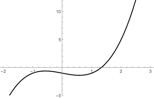 Let \(f(x) = x^3-x-1\). It’s evident from a graph that there’s one root.