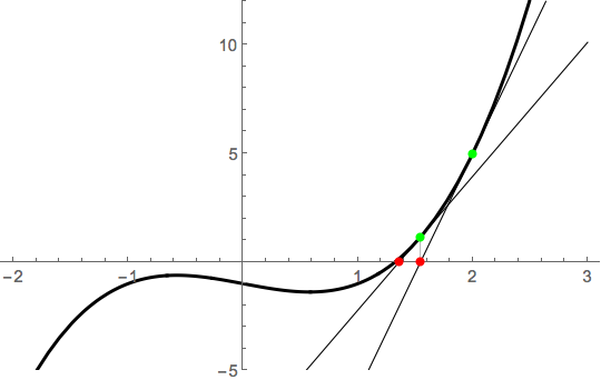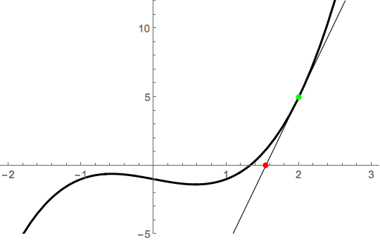 Newton’s method works by riding the tangent line from an initial guess. If we note that \(x_1=2\) is pretty close to the root, we compute \(x_2 = N(x_2)\), where \[N(x) = x - \frac{f(x)}{f'(x)} = x - \frac{x^3-x-1}{3x^2-1}.\] Thus, \(x_2 = N(2) = 2-5/11 \approx 1.54545\). Geometrically, this point is obtained by riding the tangent line to the \(x\)-axis:
