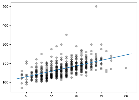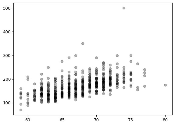 plt.plot(cdc_sample.height, cdc_sample.weight, 'ok', alpha=0.3)