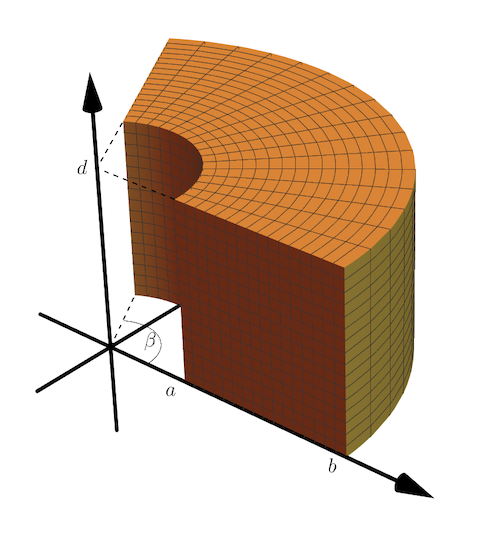 Cylindrical coordinates look a lot like polar coordinates + \(z\). The work great with spatial regions that are extrusions of polar regions along the \(z\)-axis, like so: