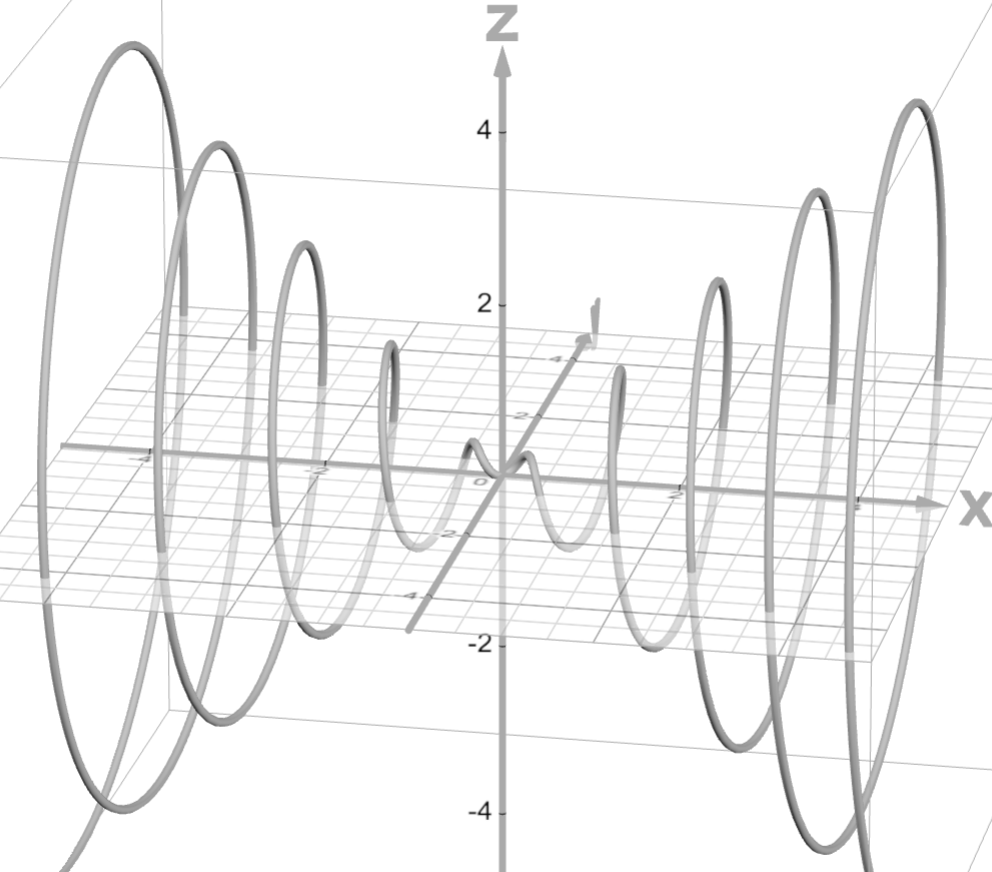 - \(\:\:\displaystyle \vec{p}(t) = t\left\langle 1,\cos\left(6t\right),\sin\left(6t\right)\right\rangle\)
