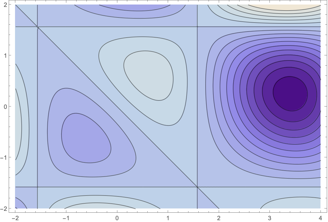 The contour diagram of \(f(x,y)=(x + y)\cos(x)\cos(y)/2\) is shown in Figure 1. Mark the locations of any maxima, minima, or saddle points that you see.