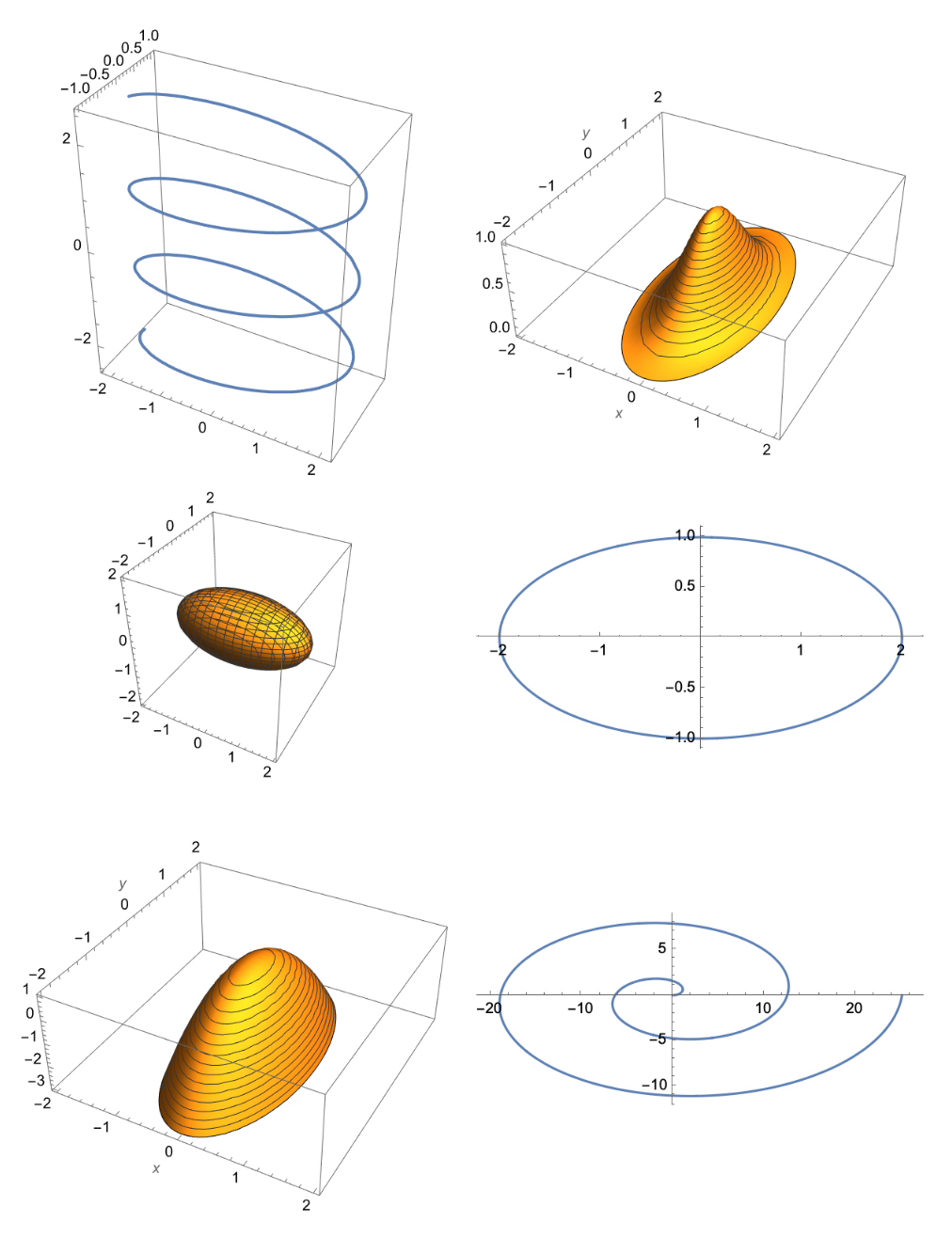 - \(\vec{p}(t) = \langle 2\cos(t), \sin(t), t/4 \rangle\)