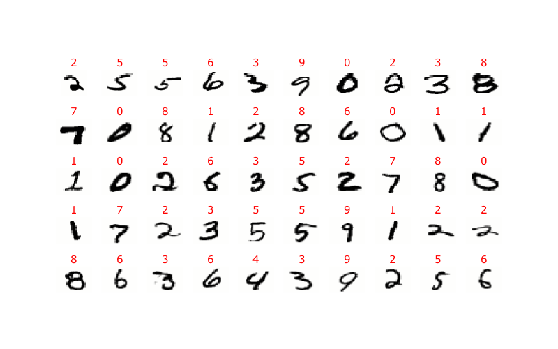 Again, the data consists of a list of 784 dimensional vectors of grayscale values with labels. It’s easy to render those vectors as grayscale images and display them with their labels. Here’s a short subset of the results: