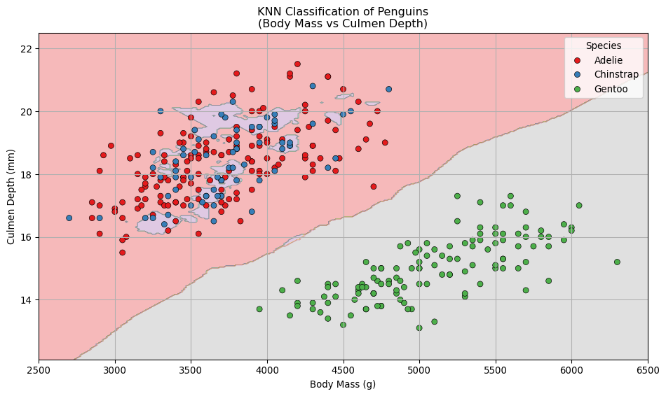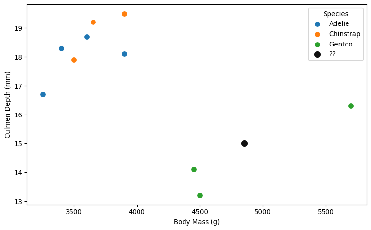 Here’s a plot of that same data in the body_mass/culmen_depth plane. The classification is even more obvious, now.