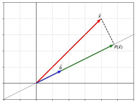 Since \(P(\vect{x})\) lies on the the subspace determined by \(\vect{b}\), we can write \[P(\vect{x}) = \lambda \vect{b}\] for some scalar \(\lambda\). The orthogonality condition then implies that \[ (P(\vect{x})-\vect{x}) \cdot \vect{b} = (\lambda\vect{b}-\vect{x}) \cdot \vect{b} = 0. \] We can solve that for \(\lambda\) to get \[ \lambda = \frac{\vect{b} \cdot \vect{x}}{ \vect{b}\cdot\vect{b}} \text{ so that } P(\vect{x}) = \frac{\vect{b}\cdot\vect{x}}{\vect{b}\cdot\vect{b}} \vect{b}. \]