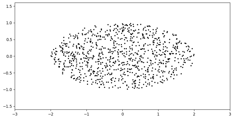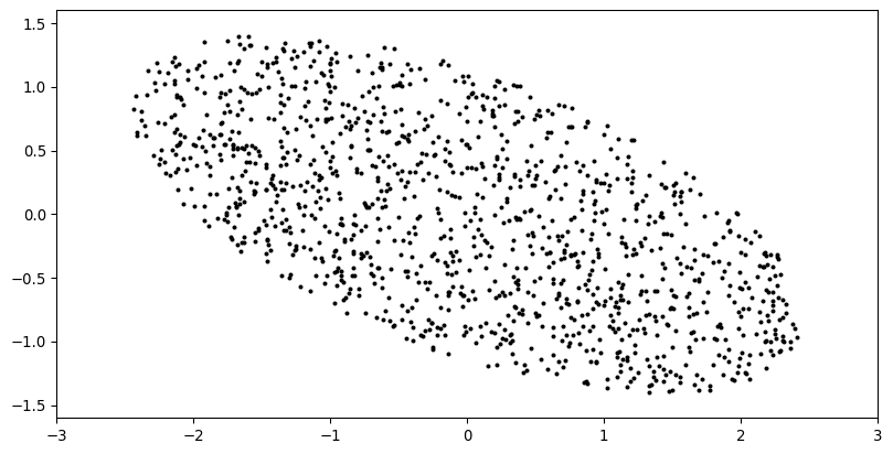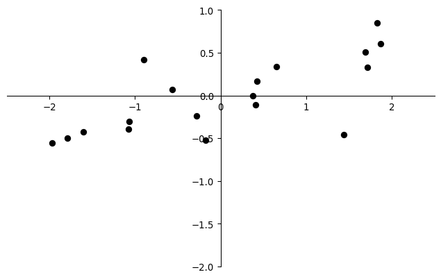 mean = np.mean(data, axis=0)centered_data = data - mean[x,y] = centered_data.Tplt.plot(x,y, 'ok')ax = plt.gca()ax.set_xlim(-2.5,2.5)ax.set_ylim(-2,1)ax.set_aspect(1)fig = plt.gcf()ax.spines['left'].set_position('zero')ax.spines['bottom'].set_position('zero')ax.spines['right'].set_color('none')ax.spines['top'].set_color('none')fig_data = pickle.dumps(fig)