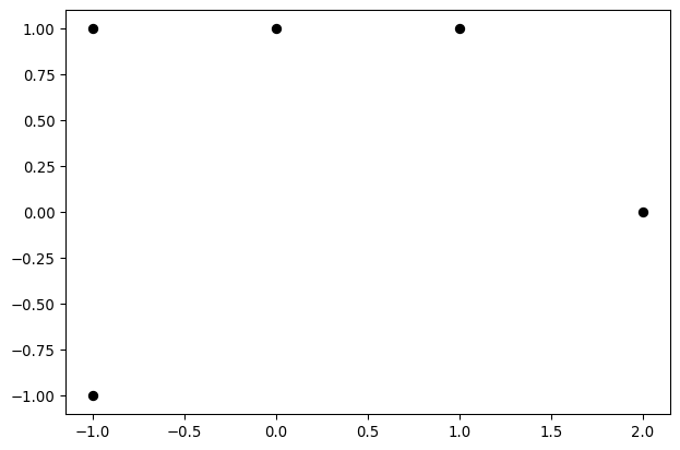 X = np.matrix([[-1,-1],[-1,1],[0,1],[1,1],[2,0]])x = X[:,0]y = X[:,1]plt.plot(x,y,'ok')plt.gca().set_aspect('equal')
