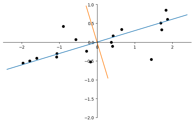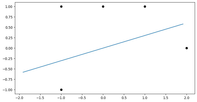 v = np.asarray(eigen_info[1][:, 0]).ravel()plt.plot(x,y,'ok')plt.plot([-2*v[0],2*v[0]],[-2*v[1],2*v[1]])plt.gca().set_aspect('equal')
