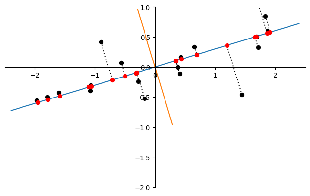 fig = pickle.loads(fig_data)# Project onto first principal component v1def P(x):return (v1.dot(x)/v1.dot(v1)) * v1for [x,y] in centered_data: [xx,yy] = np.array(P([x,y])).T plt.plot([x,xx],[y,yy], 'k', linestyle = (0,(1,2))) plt.plot([xx],[yy], 'or')