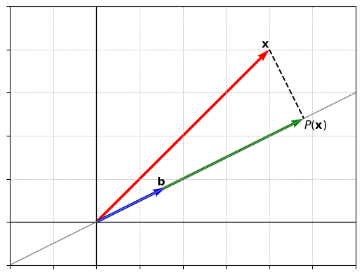 Recall that the the basic idea of orthogonal projection of the vector \(\vect{x}\) onto \(\vect{b}\) is to find a vector \(P(\vect{x})\) such that \(\vect{x}-P(\vect{x})\) is perpendicular to \(\vect{b}\). Intuitively, \(P(\vect{x})\) is the shadow of \(\vect{x}\) on the line determined by \(\vect{b}\).